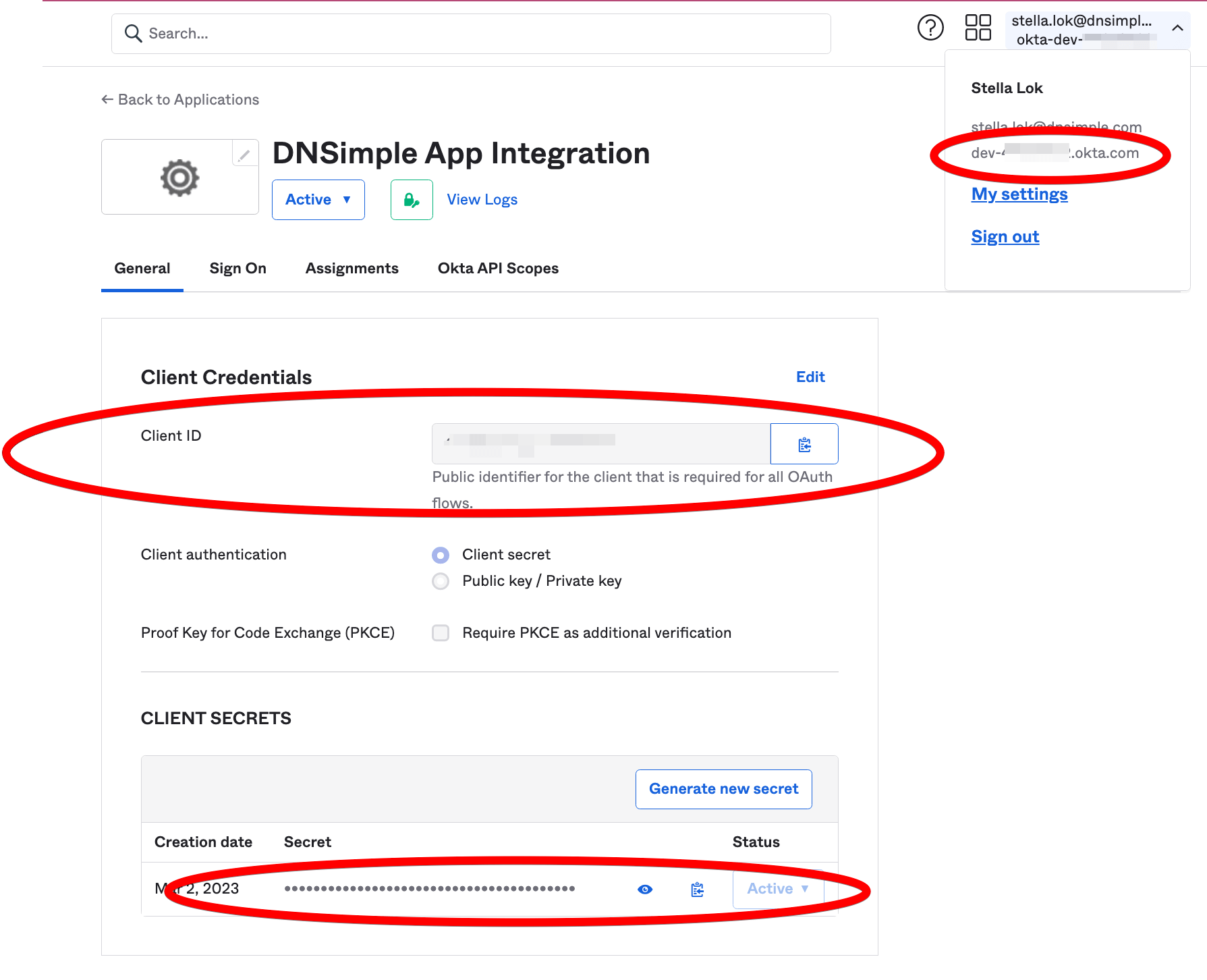 - Click the Sign On tab. Note the client ID and client secret, as you will need them to configure DNSimple for Okta SSO.